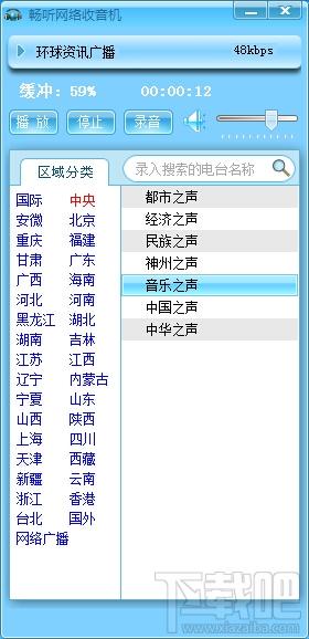 畅听网络收音机1.简洁实用,断网自动连接。2.支持自定义电台列表,可增加、删除、修改电台。3.电台列表可备份成文件,可用备份的文件还原列表。4.可后台播放,将窗口隐藏起来播放。5.自动记忆上一次播放的电台频道、音量。6.支持电台录音成文件功能。7.支持定时录音、定时关闭功能。8.播放录音文件。9.自动更新电台。